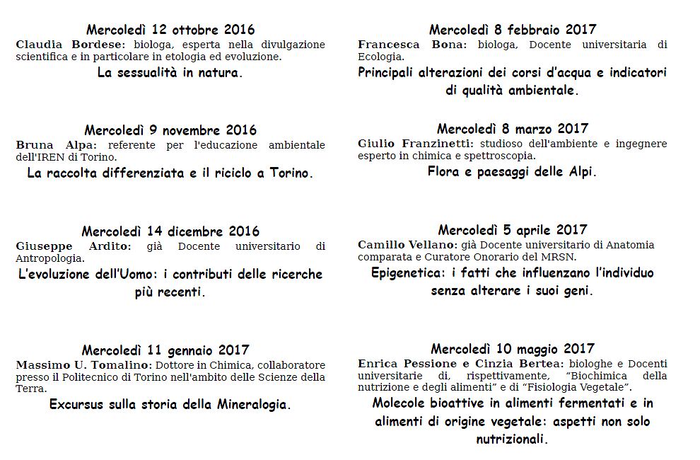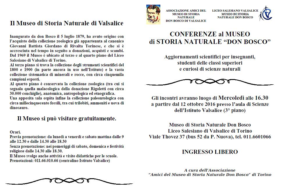 Il ciclo di conferenze (aggiornamenti scientifici per insegnanti, studenti delle classi superiori e curiosi di scienze naturali), organizzato dell’Associazione degli Amici del Museo Don Bosco di Torino, è composto da nove incontri che avranno luogo il mercoledì alle 16.30, a partire dal 12 ottobre 2016, presso il Museo di Storia Naturale di Valsalice, nell’aula di scienze, terzo piano, dell’Istituto Valsalice. L'ingresso è libero e non occorre prenotazione.