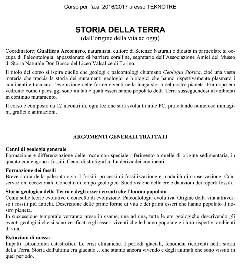 Il corso, organizzato dall'Istituto di Cultura TEKNOTRE, nell'ambito dell'Anno Accademico 2015-2016, è composto da dodici lezioni su temi vari di scienze naturali. Le lezioni si terranno di lunedì (ore 16.00 - 18.00) con inizio il 7 novembre 2016. Si svolgeranno presso l'Istituto di Cultura TEKNOTRE, via Pricipessa Clotilde 95/A - 10144 Torino, tel.: 011 4376565. Per le iscrizioni al corso, le date e gli orari, occorre contattare direttamente TEKNOTRE. Il programma è il seguente: