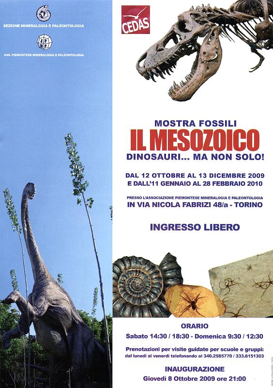 L'inaugurazione della mostra (aperta a tutti) si terrà giovedì 8 ottobre 2009 alle ore 21. La visita alla mostra sarà preceduta da un breve conferenza introduttiva (con presentazione di diapositive realizzata tramite tramite PC) dal titolo Il Mesozoico (relatore: Gualtiero Accornero).