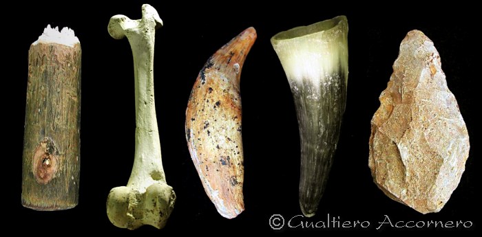 I materiali della cultura osteodontocheratica Nell'immagine ho inserito i materiali che furono utilizzati nella cosidetta "età della pietra". A sinistra compare il legno, facilmente deperibile, infatti i manufatti sono rarissimi. In cetro si vede osso, dente e corno, i materiali della cultura osteodontocheratica ed infine la pietra (in questo caso una amigdala) i cui reperti, conservandosi senza problemi per temi lunghissimi, sono innumerevoli. |