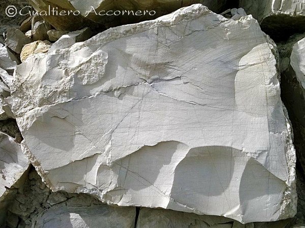 ![]() Esempio di frattura concoide Blocco di calcare del Cretaceo (strada dell'"Incompiuta", presso Imperia) a grana finissima: si vede chiaramente la frattura tipo concoide, di aspetto ovoidale, caratteristica di vetri e materiali privi di struttura cristallina. Questo termine deriva dal greco konchoeidès, cioè "a forma di conchiglia" e ne descrive bene l'aspetto come si vede chiaremente dalla foto. |