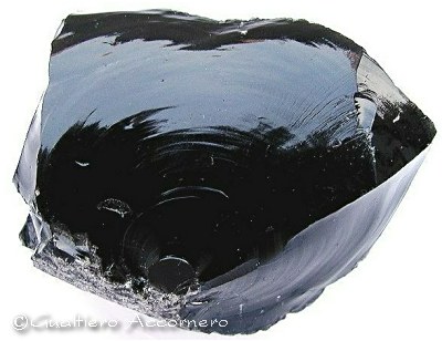 Ciottolo di ossidiana spezzato Campione proveniente dalle zone intorno al vulcano spento del monte Arci (Sardegna), si nota la grande ed evidente la frattura di tipo concoide |