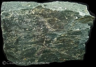 Campione di Ofiolite L'Ofiolite, detta anche pietra verde, è una roccia metamorfica che deriva da antichissime parti di crosta oceanica. Il nome deriva dal greco ophis = serpente e lithos ("roccia serpente") per la caratteristica colorazione verdognola che ricorda la pelle dei rettili. Per la sua durezza veniva spesso usata per realizzare asce tramite levigazione (campione raccolto nelle valli di Lanzo). |