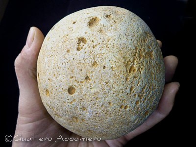 ![]() Gli arnioni di selce Tipici noduli di selce provenienti dalla zona del promontorio del Gargano. A sinistra: un arnione di selce perfettamente sferico. A destra un arnione globulare spezzato in cui si nota il cortice che circonda la selce dell'interno. Questa qualità di selce viene detta "piromaca" in quanto un tempo con essa si realizzavano le pietre focaie per gli accendini e per le pistole ad avancarica. |