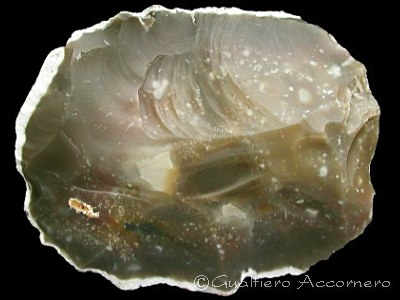Ciottolo di selce spezzato Si noti la frattura tipo concoide ed il tipico bordo calcareo biancastro che circonda il ciottolo che viene detto cortice (rive del fiume Misa, nelle Marche). |