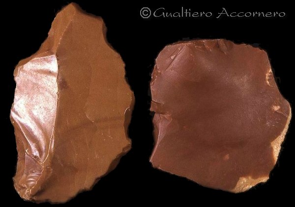 ![]() La patina dell'antichità Sui manufatti preistorici si verifica un processo chimico fisico che nel tempo altera la superfice della pietra sepolta nei sedimenti o esposta alle intemperie rendendola traslucida ed untuosa al tatto. Si tratta della “patina dell’antichità” detta famigliarmente patina. Nella fotografia a sinistra si nota la patina di un raschiatoio del Paleolitico e, a destra, una scheggia attuale opaca. |