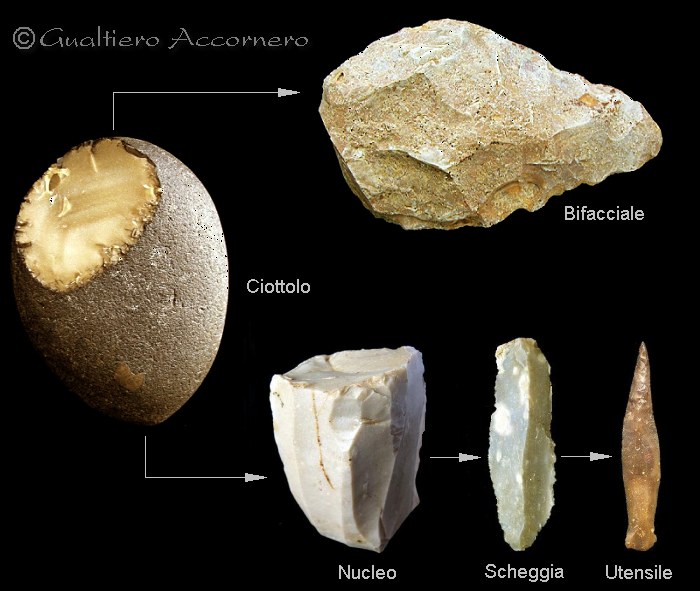 1° fase - Da un blocco di materiale più o meno preformato, chiamato nucleo, con varie metodologie, vengono distaccate delle schegge di dimensione adeguata al loro impiego.
