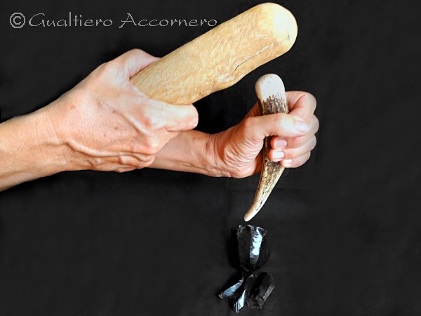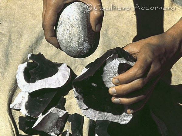 2° fase - Le schegge vengono ottenute con varie metodologie usando dei percussori, cioè “martelli” come ciottoli, clave in legno, osso e corno.