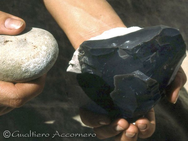 ![]() Percussione indiretta Viene illustrato il metodo della percussione indirettacon un percussore di legno di bosso di forma allungata, detto martello, e uno scalpello di corno di cervo su un nucleo di ossidiana. Con questo difficile metodo si ottengono bellissime lame regolari. |