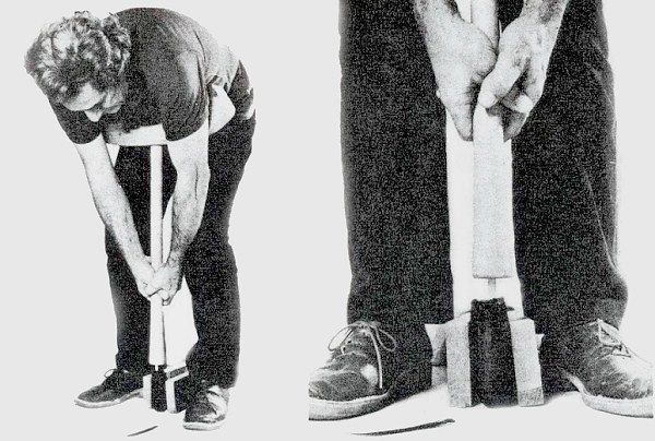 ![]() Percussione diretta "normale" on il percussore si agisce direttamente sul materiale da scheggiare tenendolo direttamente in mano. |