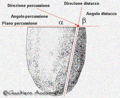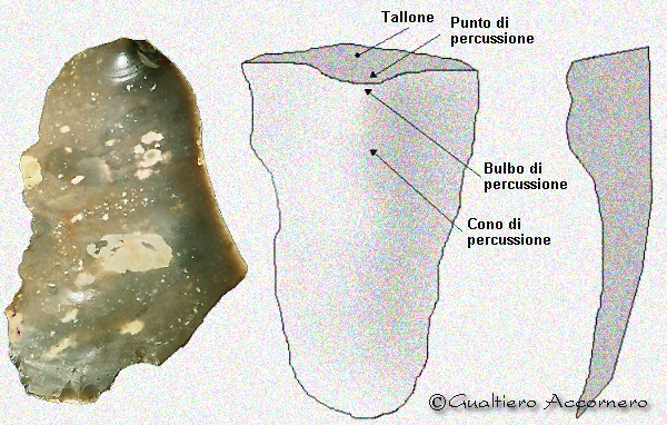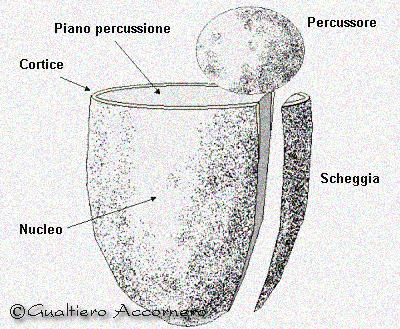 Lavorazione del nucleo llustrazione teorica in cui è possibile visionare il piano di percussione, l'angolo di distacco della sheggia, compare anche il cortice un elemento tipico di un nodulo di selce. |