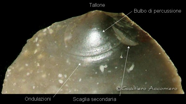 ![]() Tracce della lavorazione intenzionale Foto di una scheggia staccata intenzionalmente in cui vengono indicate le particolarità delle "tracce" della lavorazione intenzionale |