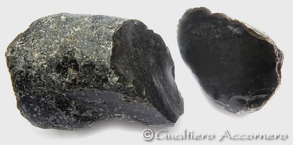 ![]() Preparazione di un nucleo di ossidiana Ciottolo di ossidiana di forma allungata a cui ho personalmente fatto saltare una estremità con un forte colpo inferto da un grosso percussore per formare la base per un nuceo. |