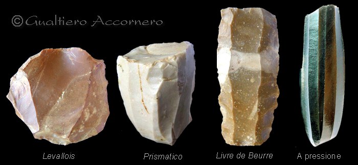 ![]() Tipologia dei principali nuclei Questa tavola illustra alcuni classici nucei già sfruttati (i reperti non sono in scala tra loro) che in sintesi riassumono le tipologie più ricorrenti in ordine di comparsa durante l'"età della pietra". |