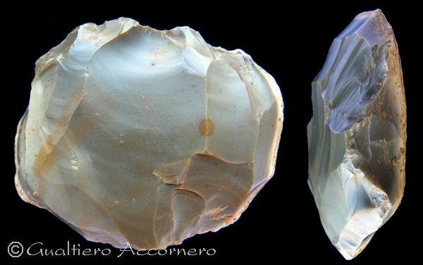 ![]() Nucleo tipo levallois Vista forntale e laterale del reperto. La forna a guscio di tartaruga non è più evidente in quanto la scheggia che è stata staccata corrispondeva in parte della parte convessa. (Paleolitico della Francia). |