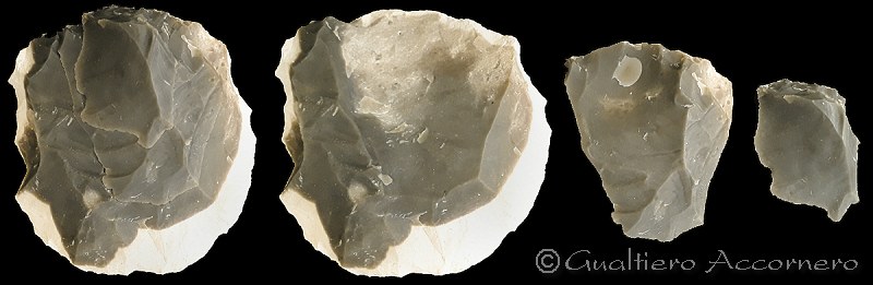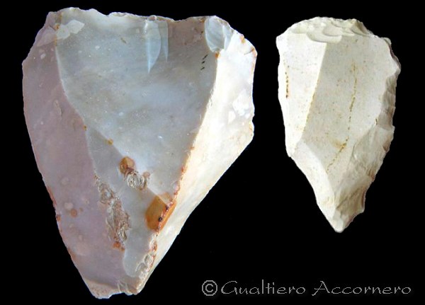 ![]() Nucleo e schegge levallois Da un nuceo tipo levallois, che ho realizzato personalmente, vengono staccate due schegge. A sinistra compare il refitting (cioè il rimontaggio del nuceo e le schegge staccate). Segue il nuceo sfruttato e le due sche'gge staccate. |