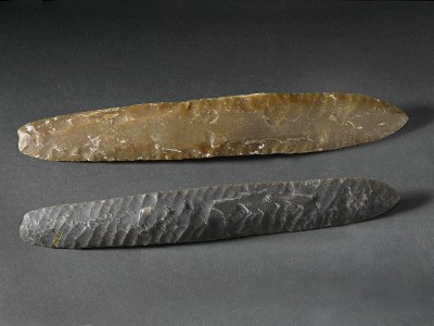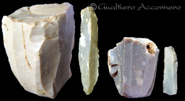 ![]() Nuclei di tipo prismatico Due esempi di nuclei prismatici del Neolitico. L'esemplare a destra è un nucleo a lamelle. Questa terminologia specifica che è di piccole dimensioni e serve per ottenere piccole lame, elementi da montare per esempio su di un falcetto. |