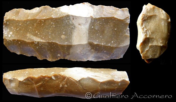 ![]() Nucleo tipo livre de beurre Le tre viste di un nucleo tipo livre de beurre. Sulla parte superiore frontale si può vedere la "cicatrice" testimone del distacco di un grande lama, i reperto è lunco circa 20 cm. |