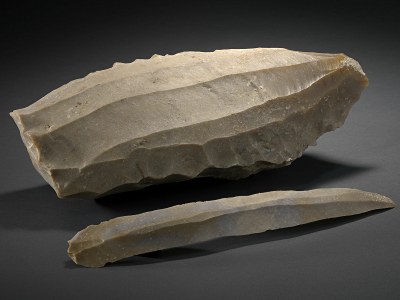 ![]() Nucleo e punta levallois La tecnica levallois prevede anche un particolare nucleo detto "da punte", espressamente messo in forma per staccare una sola punta (foto sa destra). Nella foto si può osservare che la classica forma a guscio di tartaruga in questo caso non è più presente anche se il principio della tecnologia in effetti risulta lo stesso (Paleolitico della Francia). |