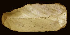 ![]() Scheggia levallois Da un nuceo tipo levallois, che ho realizzato personalmente, viena staccata un grossa scheggia. Il colpo è stato sferrato sulla porzione in alto del nuceo con il ciottolo che si vded. Si può notare la tipica leggera convessità della scheggia. |