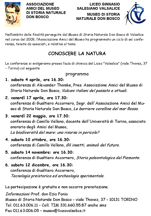 Conoscere la natura Presso il Museo di Storia Naturale Don Bosco di Valsalice Sede: c/o Liceo Salesiano Valsalice - viale Thovez 37, Torino. Telefono: 011.63.00.611 E-Mail: museo.valsalice@virgilio.it Sito Web: http://www.liceovalsalice.it/museo |
