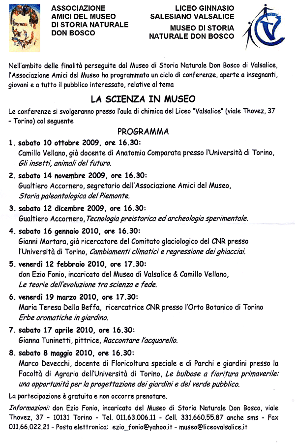 La scienza in Museo Presso il Museo di Storia Naturale Don Bosco di Valsalice Sede: c/o Liceo Salesiano Valsalice - viale Thovez 37, Torino. Telefono: 011.63.00.611 E-Mail: museo.valsalice@virgilio.it Sito Web: http://www.liceovalsalice.it/museo |