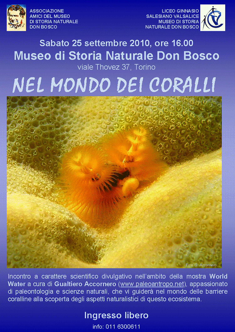 Nel mondo dei coralli Presso il Museo di Storia Naturale Don Bosco di Valsalice Sede: c/o Liceo Salesiano Valsalice - viale Thovez 37, Torino. Telefono: 011.63.00.611 E-Mail: museo.valsalice@virgilio.it Sito Web: http://www.liceovalsalice.it/museo |