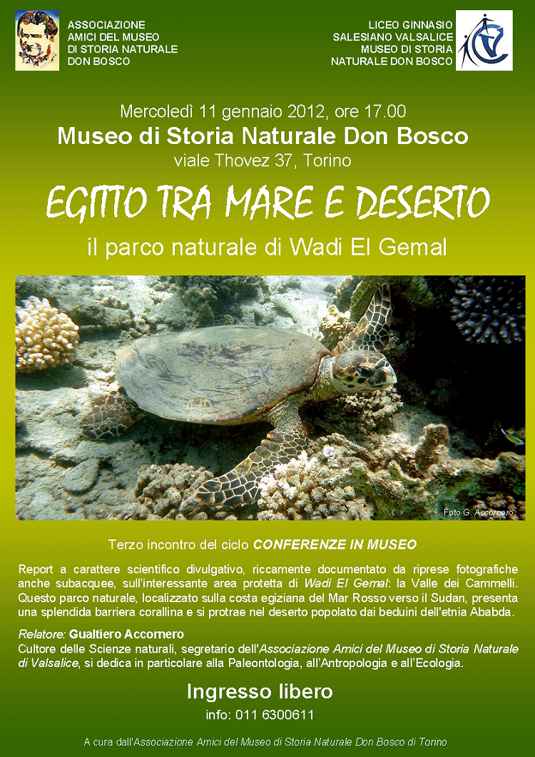 Egitto tra mare e deserto Il parco naturale di Wadi El Gemal Presso il Museo di Storia Naturale Don Bosco di Valsalice Sede: c/o Liceo Salesiano Valsalice - viale Thovez 37, Torino. Telefono: 011.63.00.611 E-Mail: museo.valsalice@virgilio.it Sito Web: http://www.liceovalsalice.it/museo |