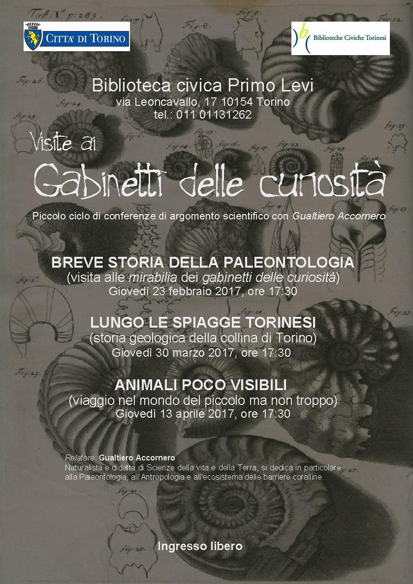 Il ciclo di tre conferenze di Scienze Naturali a carattere paleontologico che avranno luogo il giovedì alle 17.30, a partire dal 23 febbraio 2016 (vedere programma), presso la Biblioteca Civica Primo Levi, via Leoncavallo 17 - 10154 Torino. L'ingresso è libero e non occorre prenotazione.