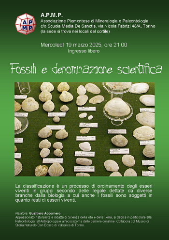 Fossili e denominazione scientifica Presso La APMP (Associazione Piemontese di Mineralogia e Paleontologia) Sede: via Nicola Fabrizi n°48/A (cortile ex Scuola Media De Sanctis, ora Costantino Nigra), 10143 Torino Sito Web: https://apmpsite.wordpress.com |