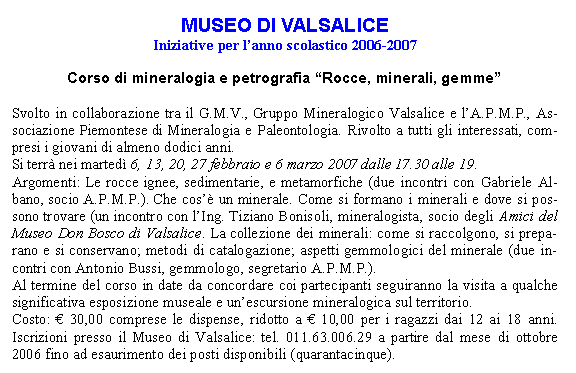 Rocce, minerali, gemme Presso il Museo di Storia Naturale Don Bosco di Valsalice Sede: c/o Istituto Salesiano "Valsalice", viale Thovez 37 10131 TORINO. Telefono: 011.63.00.611; cell.: 331.66.05.587; fax: 011.66.02.221 E-Mail: museo@liceovalsalice.it Sito Web: http://www.liceovalsalice.it/museo |