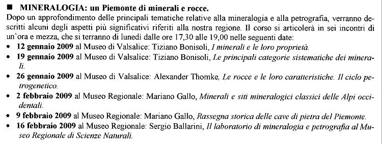 Nell’ambito della collaborazione nel settore formativo tra il Museo Regionale di Scienze Naturali e il Museo di Storia Naturale Don Bosco di Valsalice di Torino è stato organizzato il corso di mineralogia Un Piemonte di minerali e rocce aperto a tutti gli interessati che si svolgerà in parte presso l’aula di chimica del Liceo "Valsalice" (viale Thovez 37, Torino), e in parte presso la sala conferenze del Museo Regionale di Scienze Naturali (via Giolitti 36, Torino).