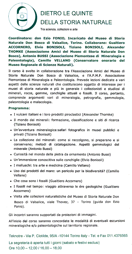 Il corso, organizzato dall'Istituto di Cultura TEKNOTRE nell'ambito dell'Anno Accademico 2009-2010, è composto da dodici lezioni su temi paleontologici e geologici. Le lezioni iniziano martedì 3 novembre 2009. Per le iscrizioni al corso, le date e gli orari, occorre contattare direttamente il TEKNOTRE agli indirizzi riportati in questa pagina. Il programma è il seguente:
