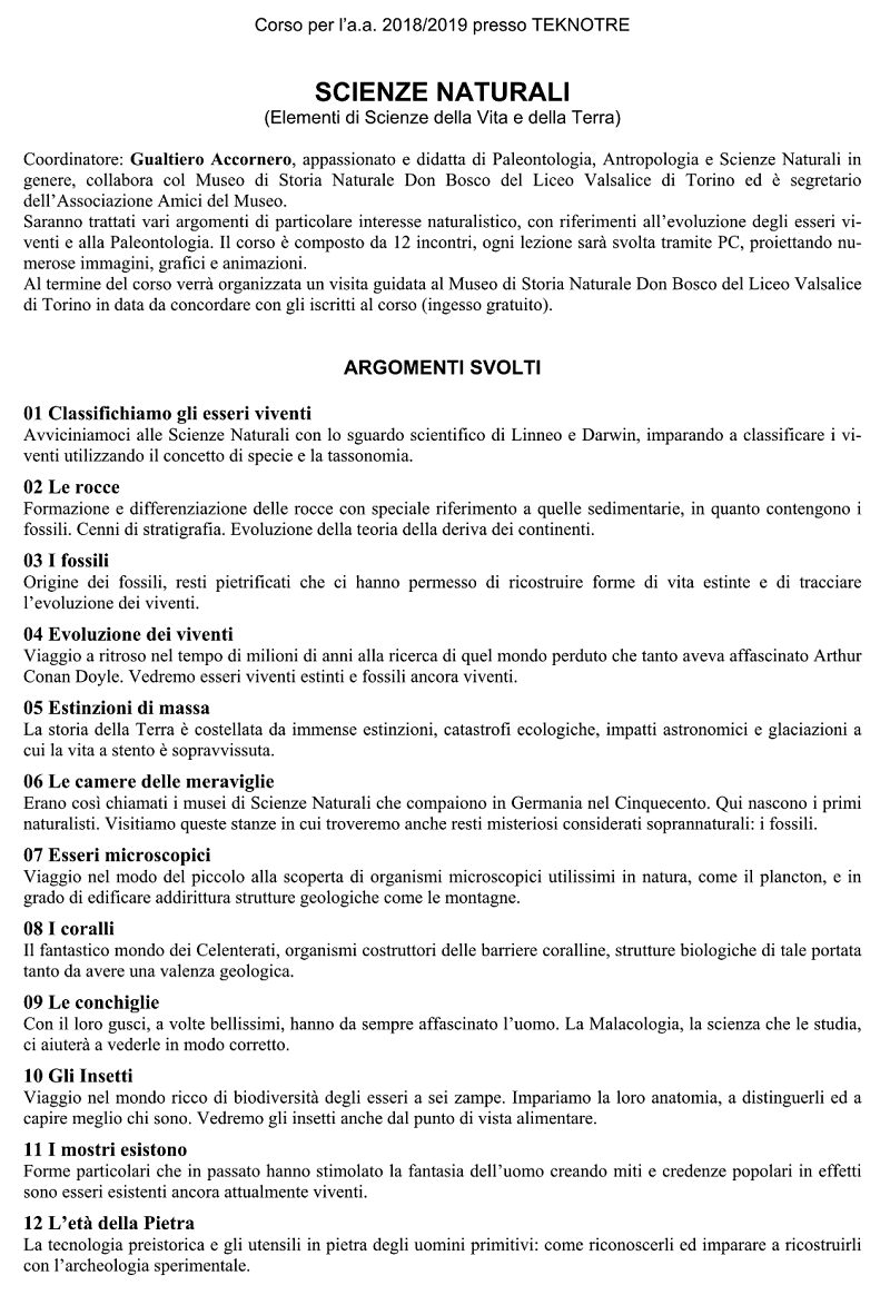 Il corso, organizzato dall'Istituto di Cultura TEKNOTRE, nell'ambito dell'Anno Accademico 2018-2019, è composto da dodici lezioni su temi vari di scienze naturali. Le lezioni si terranno di lunedì (ore 16.00 - 18.00) con inizio il ... novembre 2018. Si svolgeranno presso l'Istituto di Cultura TEKNOTRE, via Pricipessa Clotilde 95/A - 10144 Torino, tel.: 011 4376565. Per le iscrizioni al corso, le date e gli orari, occorre contattare direttamente TEKNOTRE. Il programma è il seguente: