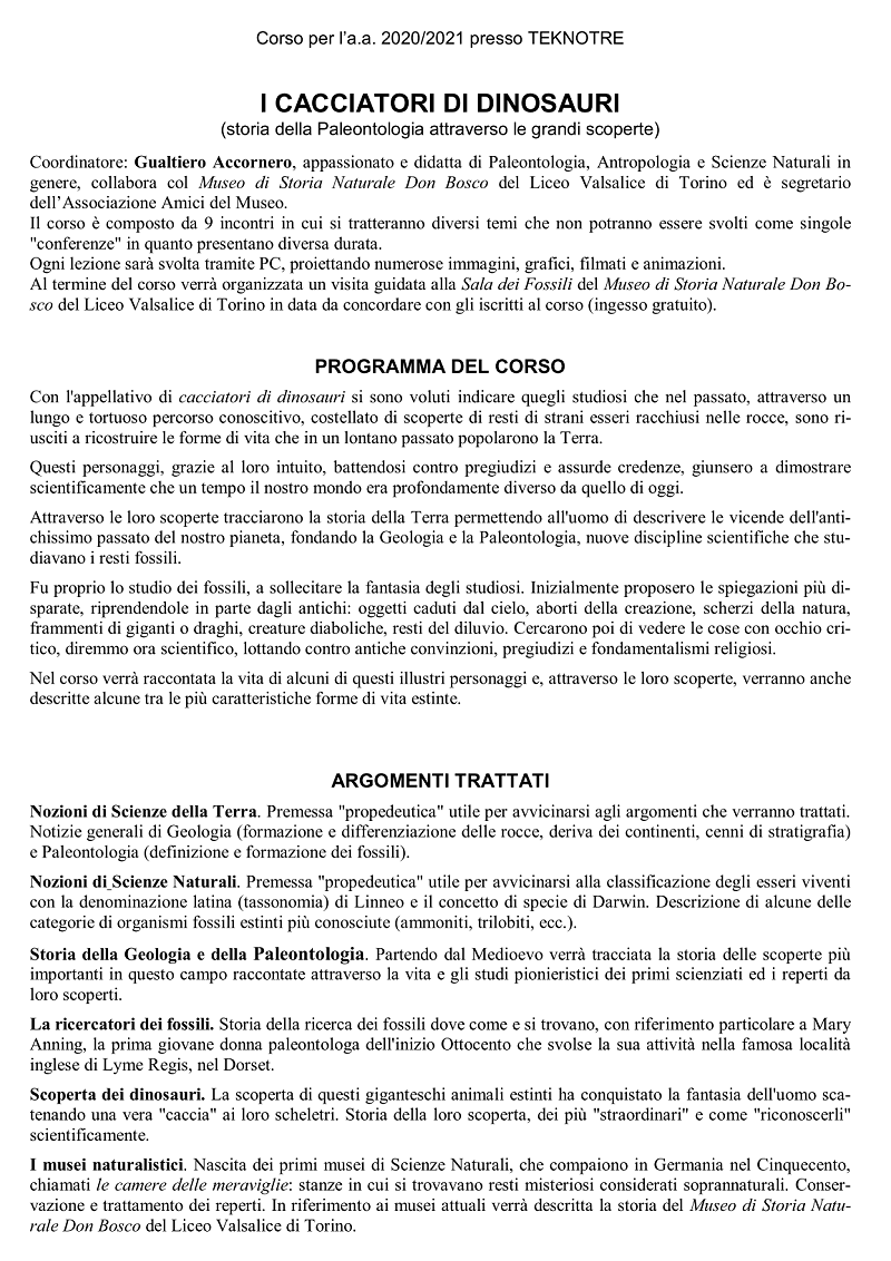 Il corso, organizzato dall'Istituto di Cultura TEKNOTRE, nell'ambito dell'Anno Accademico 2020-2021, è composto da dodici lezioni su temi vari di paleontologia.