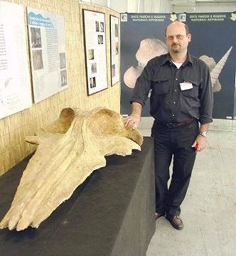 Nella foto a sinistra: il dott. Piero Damarco, responsabile del settore paleontologico dell'Ente Parchi e Riserve Naturali Astigiani, vicino ai resti di una balena fossile scoperta nei sedimenti del Pliocene dell'Astigiano.