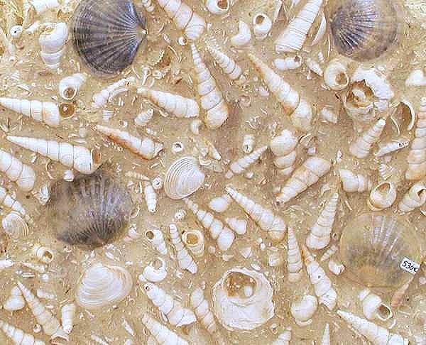 Tavolo con esemplari fossili provenienti dalla Francia: particolare di una bellissima tanatocenosi a gasteropodi e lamellibranchi.