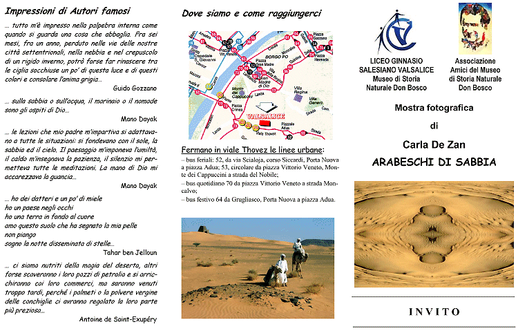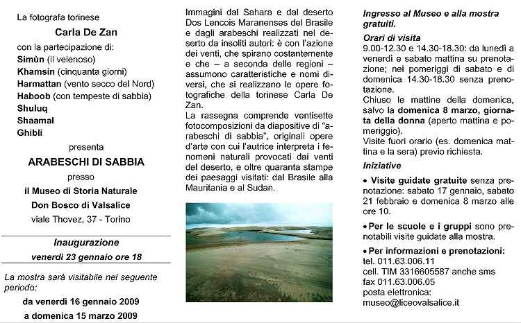 Arabeschi di sabbia Presso il Museo di Storia Naturale Don Bosco di Valsalice Sede: c/o Liceo Salesiano Valsalice - viale Thovez 37, Torino. Telefono: 011.63.00.611 E-Mail: museo.valsalice@virgilio.it Sito Web: http://www.liceovalsalice.it/museo |