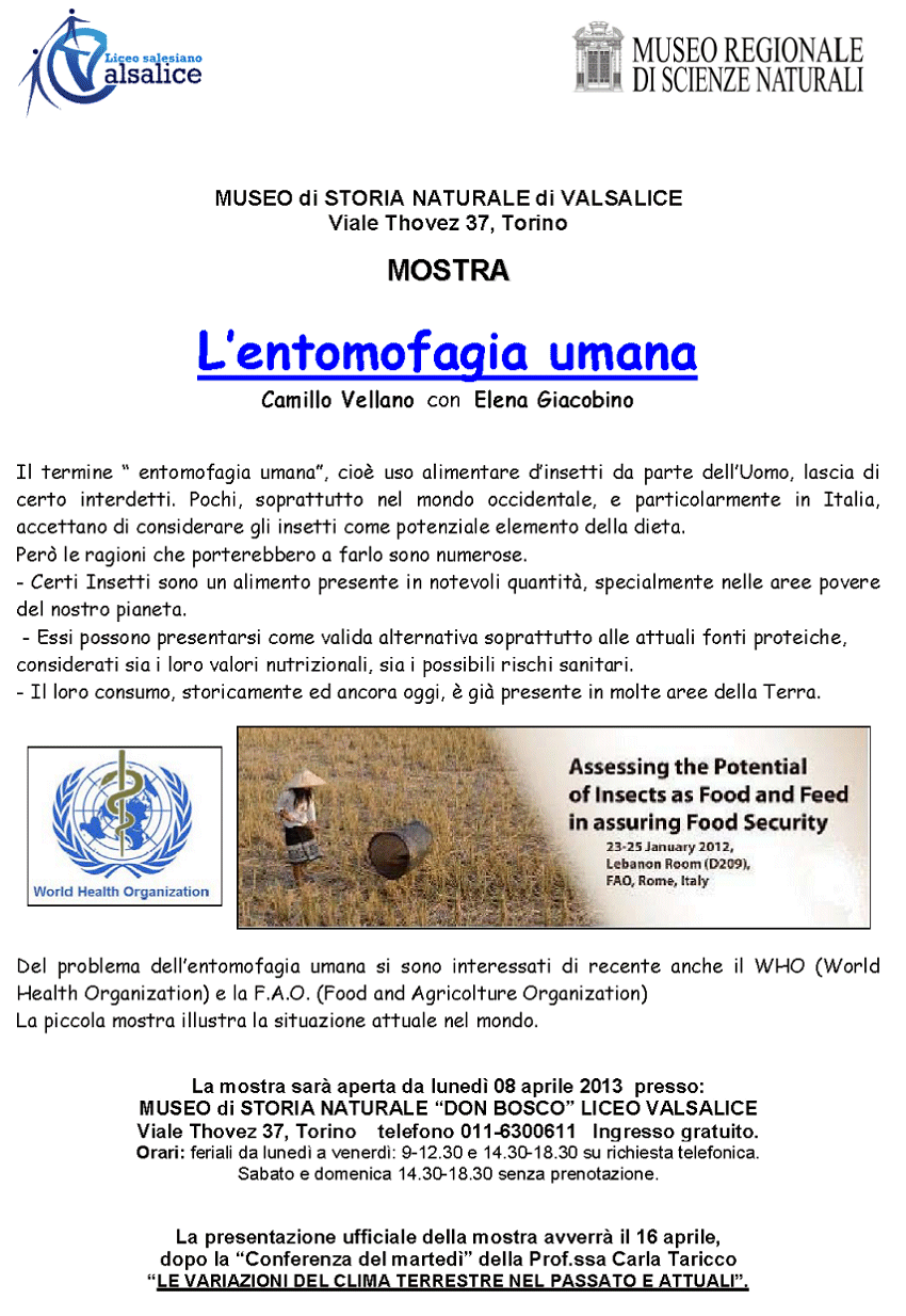 L'entomofagia umana Presso il Museo di Storia Naturale Don Bosco di Valsalice Sede: c/o Istituto Salesiano Valsalice, viale Thovez 37 - 10131 Torino Telefono: 011.63.00.611 E-mail: museo@liceovalsalice.it Sito del museo: www.liceovalsalice.it/museo_di_storia_naturale_don_bosco.php Sito Associazione Amici del Museo: www.amicimuseovalsalice.org |