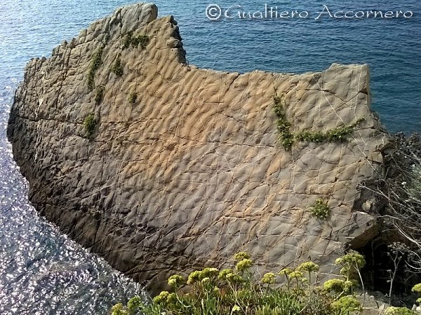 Ripple marks fossili La foto ritrae una spiaggia fossile con splendide strutture sedimentarie fossili del Cretaceo. Sono grandi ripple marks che affiorano in mare presso il Capo Berta a Diano Marina (IM), una località che, data la bellezza delle strutture, sarebbe da segnalare come geosito. |