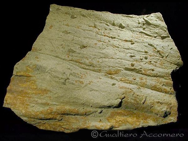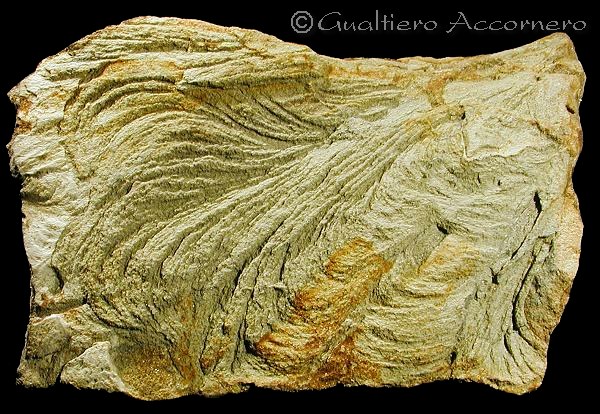 Ecco un tipico esempio di tracce fossilizzate strutture sedimentarie (queste sono in "negativo") simili a quelle descritte sopra: è un fondo marino risalente all'Eocene medio (cave presso Trino Vercellese). Si possono notare le ondulazioni del fondo e tracce del passaggio di piccoli ciottoli trascinati dalla corrente: sono tracce di impatto che vengono chiamate flute cast.