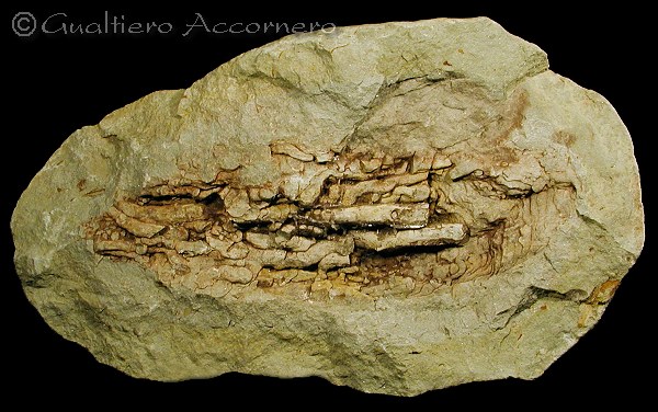 Teredini fossili Un frammento di legno fossile completamente distrutto da gallerie di teredini compare in questo ciottolo spezzato a metà, formatosi per erosione di sedimenti oligocenici, raccolto in Piemonte nei dintorni di Aqui Terme. |