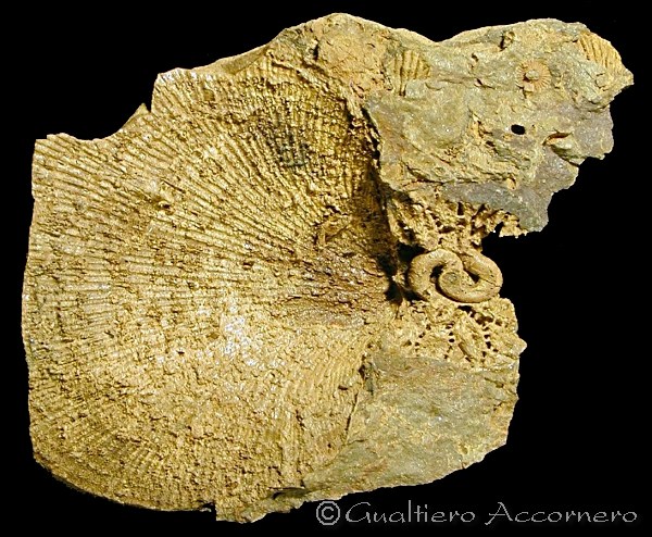 Pleurodyctium Con questo nome viene indicata questa struttura ad "S" che si trova in corrispondenza della parte terminale di un bivalve fossile. Un traccia "problematica": probabilmente si tratta di un parassita. Il campione proviene dagli starti del Devoniano della Francia del nord, sulla Manica. |