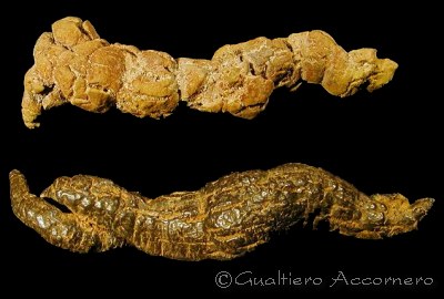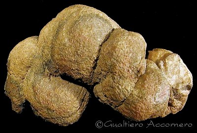 Gallerie di crostacei Questa strana struttura appartiene alla categoria Domichnia. Si tratta di una galleria, una tana, di crostacei che, più consitente, si è conservata in "negativo" nella classica "sabbia gialla astiana" incoerente del Pliocene (zona presso Montafia, Asti). |