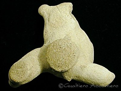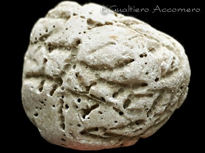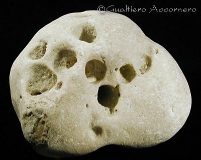 Spugne clionidi Ciottolo calcareo forato da gallerie di spugne clionidi - Pleistocene (costa di Vodice, Croazia). Queste spugne Monassonidi hanno la caratteristica di forare, forse per mezzo della secrezione di un acido, le rocce calcaree a cui aderiscono e anche i gusci di ostriche. |