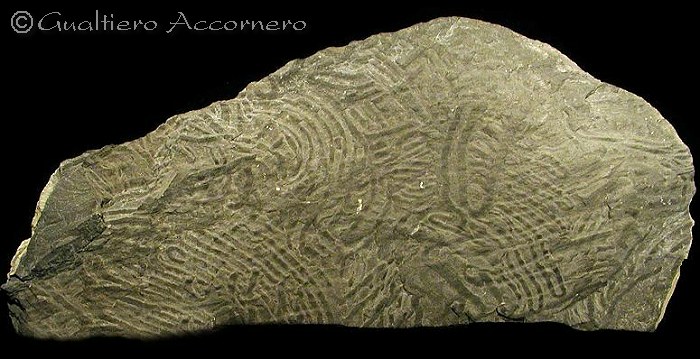 Tracce di Zoophycos Molte tracce sono ancora ben sconosciute ai paleontologi in quanto appartengono ad esseri che sono estinti e quindi mai "visti". Questa è una di quelle. Lo Zoophycos rappresenta probabilmente tracce di nutrimento Pascichnia (esplorazione del fondo per ricerca di cibo) e si ritiene sia prodotto da vermi policheti spostando il sedimento del fondo . Eocene medio (Cave presso Trino Vercellese). |