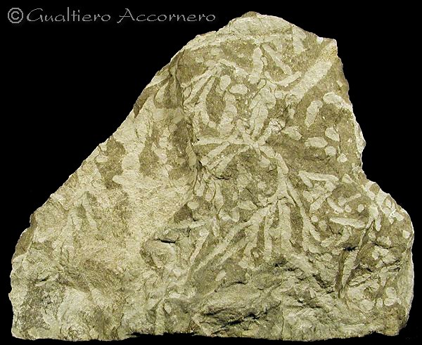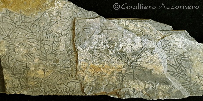 Tracce di Chondrites Queste sottili tracce ramificate (simili ai Fucoides, ma di dimensioni inferiori ) sono provenienti da strati dell'Eocene della Liguria, presentano un aspetto anastomizzato. Sono piccole tane con piccole gallerie di scavo hanno canali che si sviluppano in senso verticale ed orizzontale: anche qui si tratta di organismi in cerca di cibo nel fondo marino o tane. Attualmente sotto questo termine alcuni autori tendono a raggruppare anche i Fucoides che differiscono solo per le dimensioni. Conosciuti fin dal Paleozoico, nel loro interno non è mai stato osservato alcun organismo, pertanto sono tracce "problematiche". |