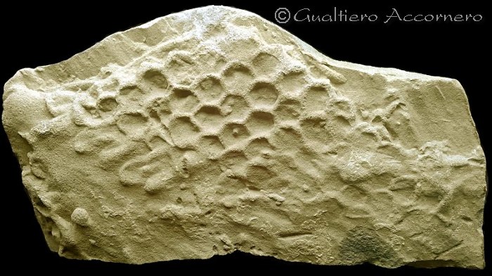 Tracce di Paleodictyon Queste impronte, che appartengono ad organismi marini noti fin a partire dal Paleozoico (forse del tipo Pascichnia o Domichnia), hanno forma di nido d'ape, dette Paleodictyon, sono state lasciate da un essere vivente ancora sconosciuto. Questo fossile fu descritto per la prima volta dal naturalista Giuseppe Meneghini nel 1850. L'origine della traccia è enigmatica e sono stati proposti numerosi candidati: la domanda è se questi siano tane di animali marini come vermi o resti fossilizzati di antichi organismi (spugne o alghe). Superficie di strato proveniente dalla Formazione di Lequio (Miocene delle Langhe). |