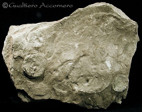 Tracce di Spirofane Impronte problematiche ancora totalmente sconosciute ai paleontologi sono costituite dalle strutture circolari che presenta questa superficie di strato. L'esemplare proviene dai terreni del Triassico (Werfen) dall'Alto Adige (Passo Foido) ed ha circa 220 milioni dai anni. |