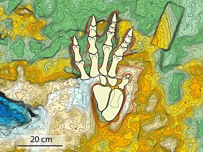 Le tracce di Isochirotherium gardettensis Una delle impronte dell'Isochirotherium gardettensis con a fianco la sua ricostruzione eseguita al compuer con software apposito di una traccia in base al modello 3D tratta dall pubblicazione scientifica (dott. Edoardo Martinetto UniTO) del 2020 (per gentile concessione). |